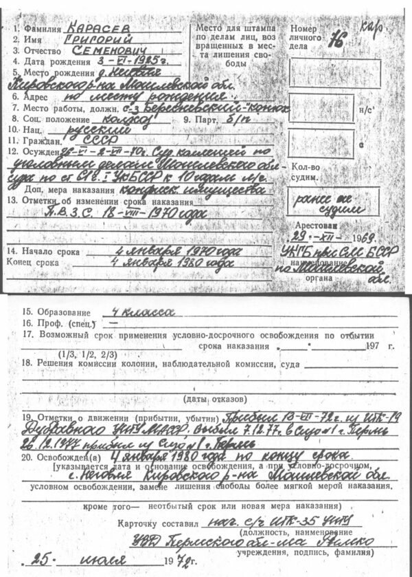 [1] Учетная карточка заключенного Г.С. Карасева; Учетная картотека Управления Дубравного ИТЛ.