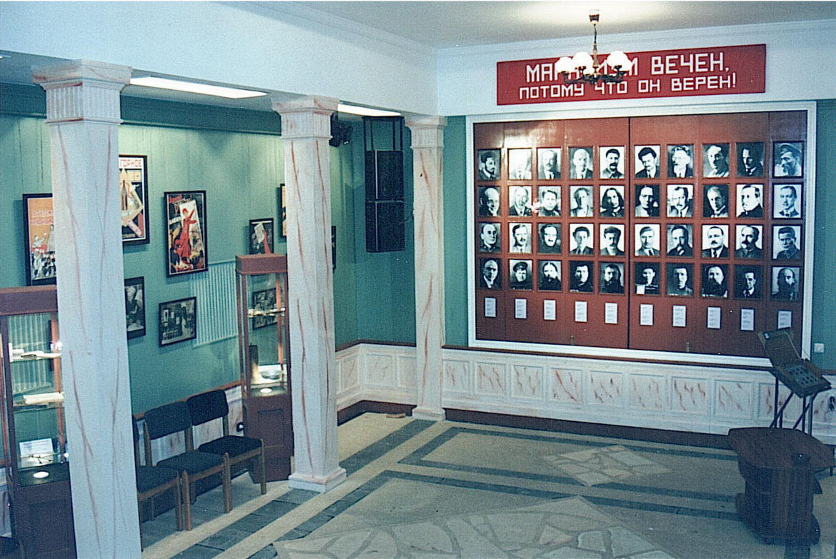Демонстрационно-выставочный зал был создан в 1999–2000 годах по инициативе и проекту Юрия Решетникова в одном из помещений внутрилагерного штаба. Зал оформлен в стилистике клубных учреждений НКВД тридцатых-сороковых годов прошлого века, в подчинении которого находилось Главное Управление лагерей – ГУЛАГ.